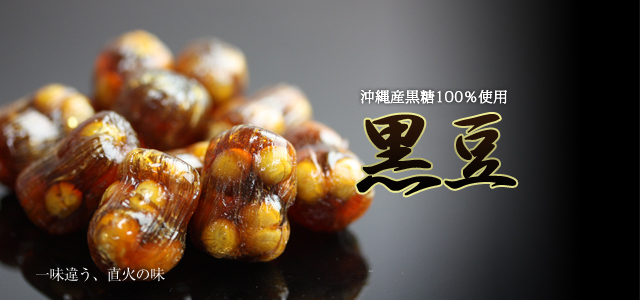 製法としては、地釜を使用し上質の砂糖、水飴と沖縄産の特等の黒砂糖をほどよく混ぜ、150度前後で直火炊きしております。更に煎り大豆をふんだんに混ぜ合わせてお作りしております。黒糖は飴の原材料にもっとも合うものを腕自慢の職人が厳選し、一番等級の高い沖縄産黒糖を使用しております。 |