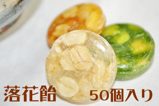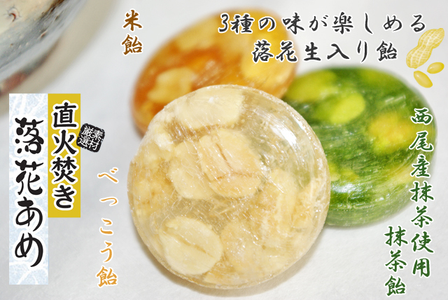 - べっこう(純糖)飴…飴本来のおいしさを知っていただけるよう、砂糖と水飴だけを使用した飴に、落花生(ピーナッツ)を練りこみました。素材の良さを最大限に引き出した「これぞ落花飴」とうなりたくなる美味しさをお楽しみください。