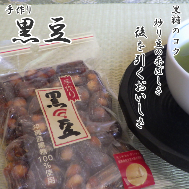 黒糖(黒砂糖)とは、さとうきびの全成分をそのまま煮つめたものです。沖縄の太陽の恵みをいっぱい浴びた黒糖には、上白糖と比べてカルシウム、カリウム、鉄分などのミネラルやビタミン類が多く含まれおり、カロリーも上白糖より少なめです。また、大豆のたんぱく質には、血中コレステロールの低下作用、肥満の改善 効果 などの生理機能があるといわれています。 ヘルシーな黒豆は定番のお茶請けとしても最適です。 ついおすすめしたくなる評判の黒糖飴“黒豆”をご家庭やご友人たちと是非お試しください。
