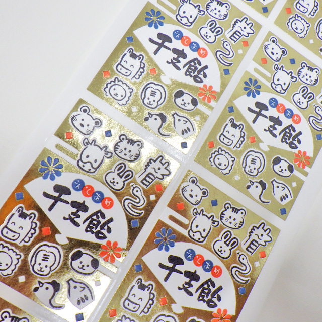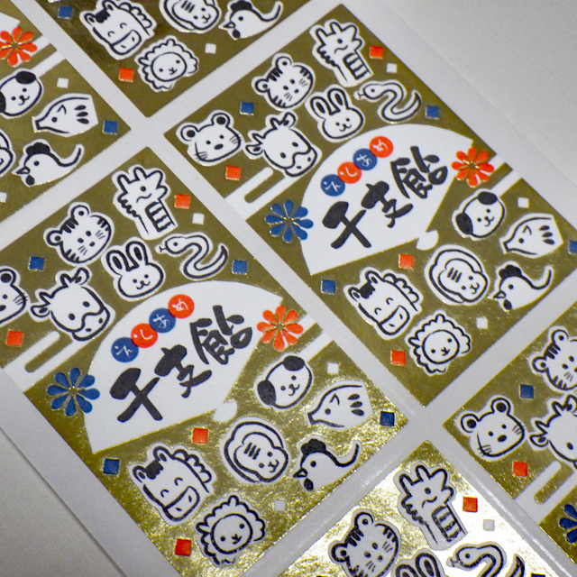 干支飴 巾着パックで使用しているの「干支飴」シールです。「自分で干支飴とシールを準備して干支飴を小分けにしてラッピングしたい!」という方のご要望にお応えしてシール単品での通信販売を開始いたしました。大量仕入れのため、お値打ちにご提供させて頂きます。こちらは十二支がデザインされたシールです。弊社干支飴をモチーフとしており、ゆるキャラのようか可愛らしさがございます。金箔で高級感があり、新年らしい和柄デザインはどなた様にお渡ししても喜ばれます。